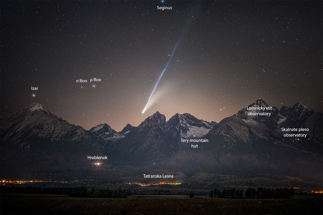 הסבר: השביט למון עורך מופע לצלמים ברחבי כדור הארץ. השביט הפוטוגני הקרוי C/2025 A6 Lemmon, החולף השבוע בסמוך לכדור הארץ פיתח שני זנבות ארוכים: זנב יונים כחול וזנב אבק לבן. זנב היונים נדחף בידי רוח השמש המשתנה תדיר, הלאה מן השמש, בה במידה ניתן לזהות במבנה הזנב עדויות להתפרצויות גז. היינון הנגרם בידי הקרינה האנרגטית של השמש אחראי לבוהק של הזנב. זנב האבק נדחף הלאה מהשביט בידי אור השמש, אשר אחראי גם לבוהק המוחזר מהאבק. התצלום המוצג מורכב מ50 חשיפות אשר נערכו לפני יומיים מ מליניקה, סלובקיה. ההרים בחזית הם הרי טטרה המפרידים חלקית בין סלובקיה ופולין. למרות שהשביט למון נראה היטב בחשיפות מצלמה ארוכות, כדור הקרח משיל המרכיבים הפך (גבולית) נראה בשמיים הצפוניים, גם בעין בלתי מצויידת, במבט לכיוון מערב, מעט אחרי השקיעה.